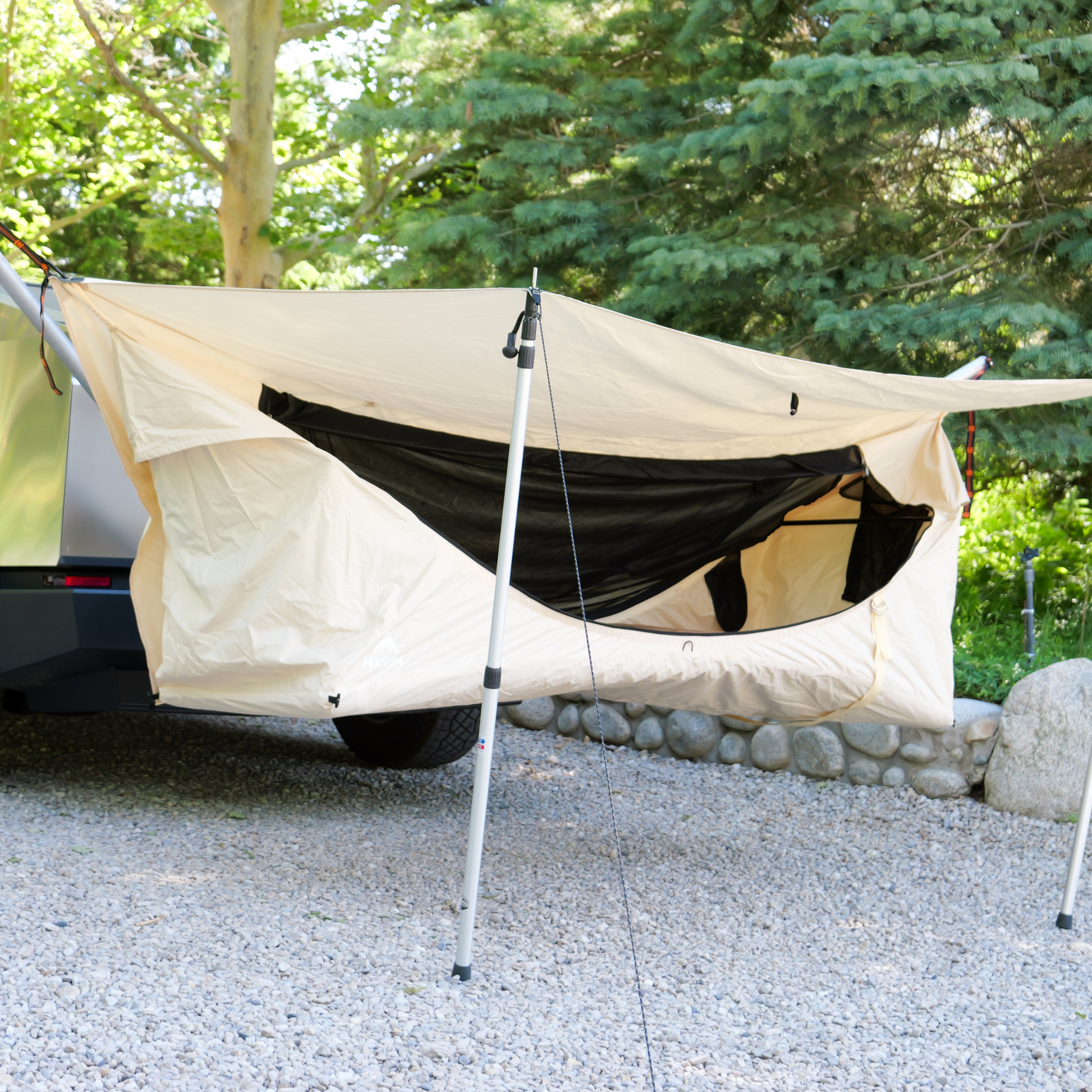 Take your hammock adventures on the road with the Bare Bones XL from Adventure Hammock Systems. Designed for ultimate versatility, this extra-large hammock mount is the perfect fit for Haven Tent, Haven XL, Haven Safari, and other 11' hammocks, thanks to its generous 125" (317 cm) span. With a 300-pound weight limit, it can easily accommodate your outdoor relaxation needs.